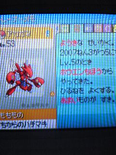 能力値の方は、ハッサムの基本的な能力を想像していただければ大体見当は付くかと。攻撃が200行かなかったのはちょっと惜しいです。まぁ性格補正ないですし…
